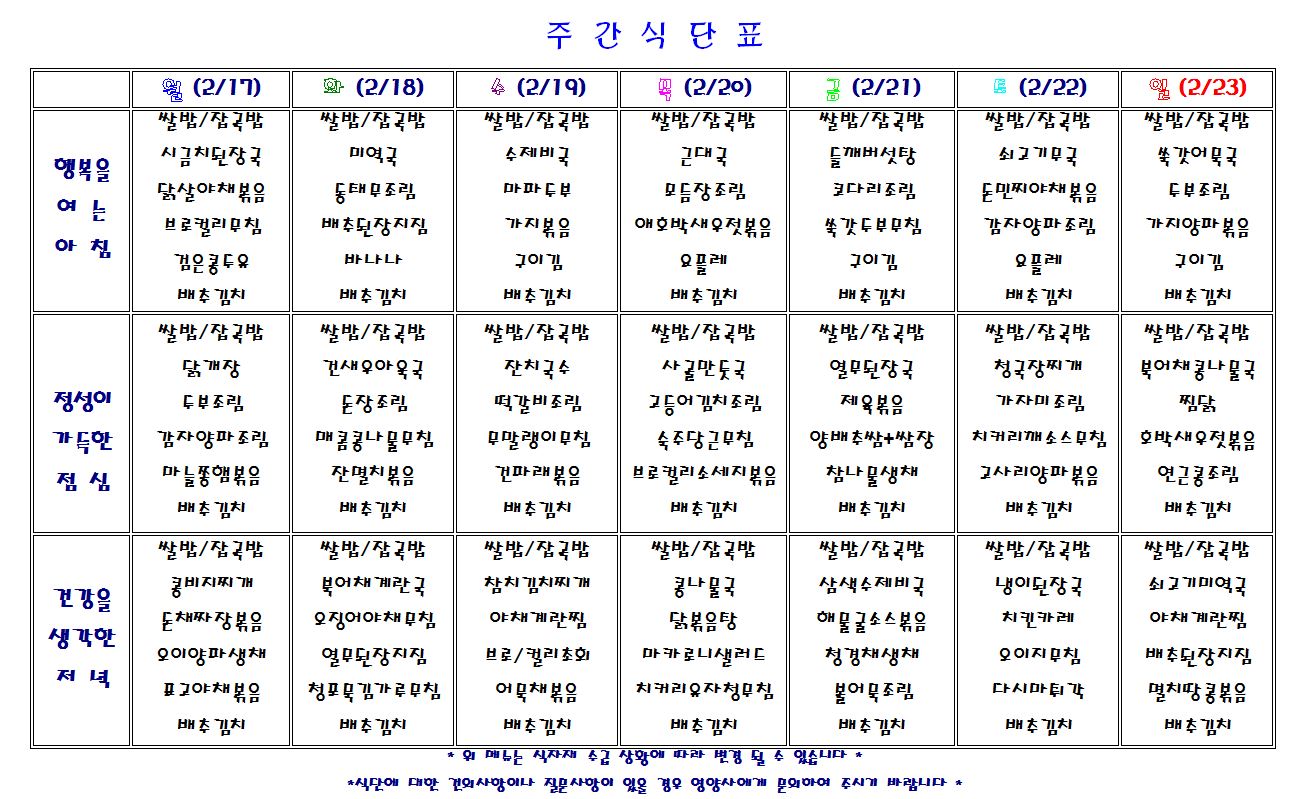 별내요양병원 2020.2.17~2.23 식단표 입니다.