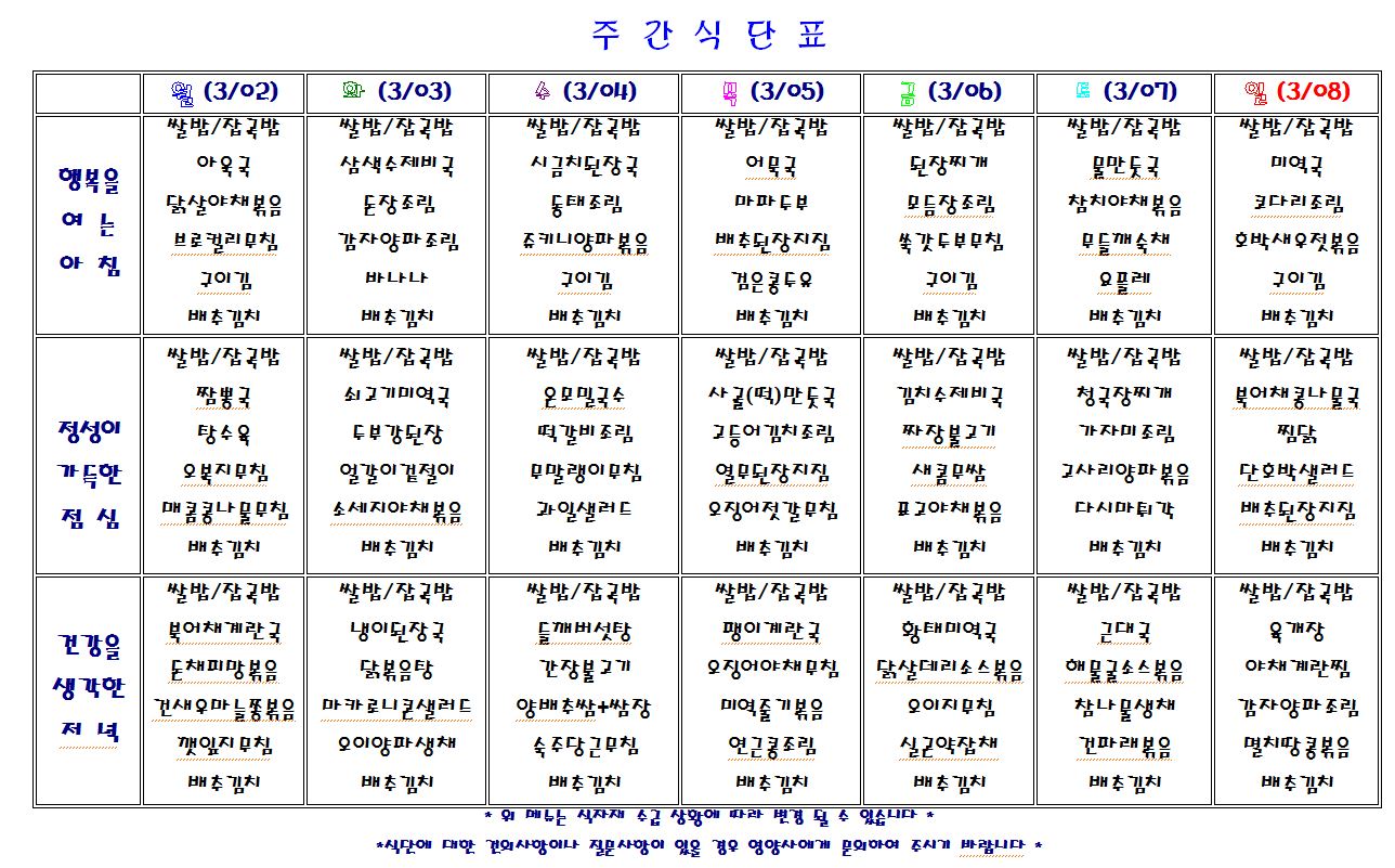 별내요양병원 2020.3.2~3.8 식단표 입니다.