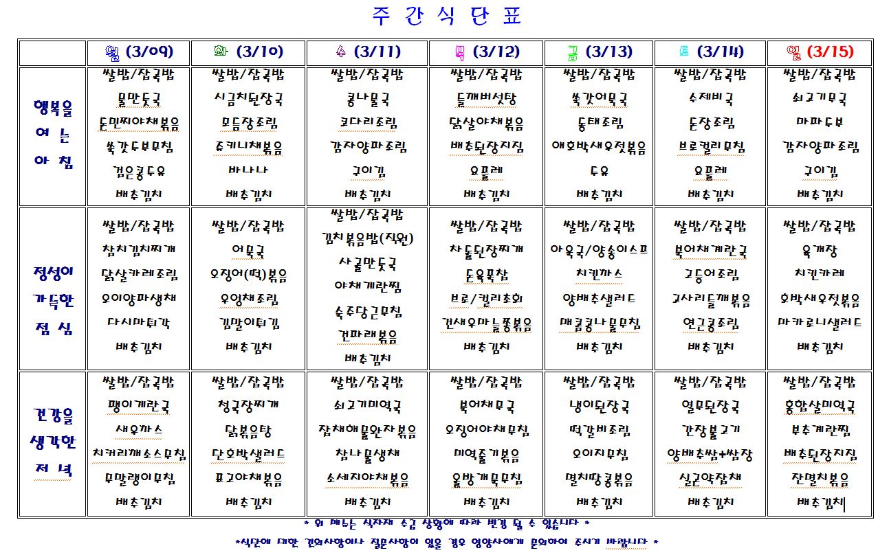 별내요양병원 2020.3.9~3.15 식단표 입니다.