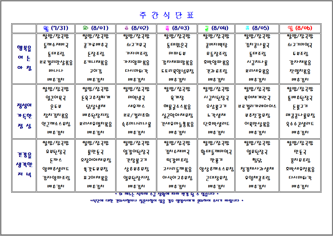 별내요양병원 2017.7.31~8.06 식단표 입니다.